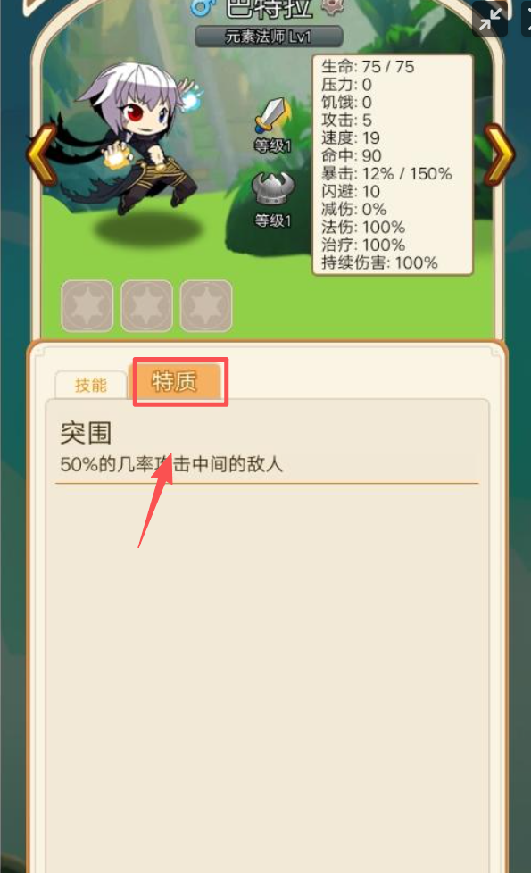 4、选择公会中的角色进入详情页,点击 “特质” 标签,查看该角色的特质技能信息。