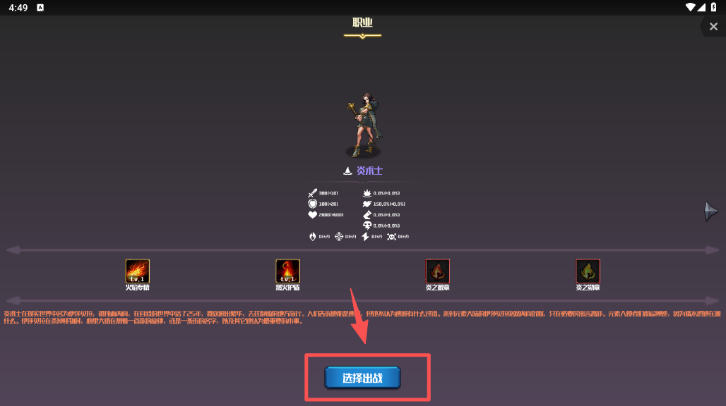 2、在职业界面选定 “炎术士” 后,点击 “选择出战” 按钮,进入游戏的合成环节。