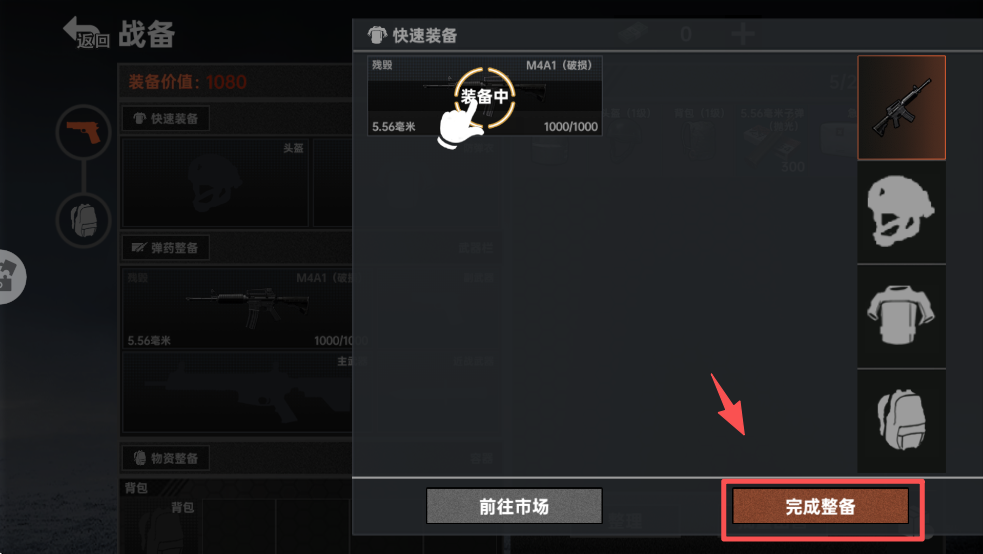 4、点击“完成整备”按钮,确认装备选择,开始游戏。