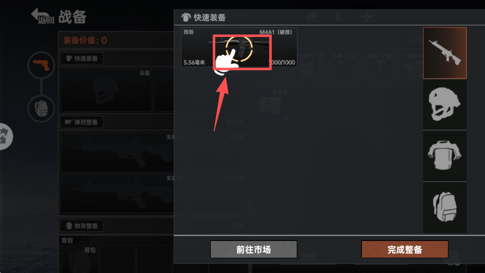 1、点击主界面的“战备”按钮,进入战备选择界面,准备装备你的战斗装备。