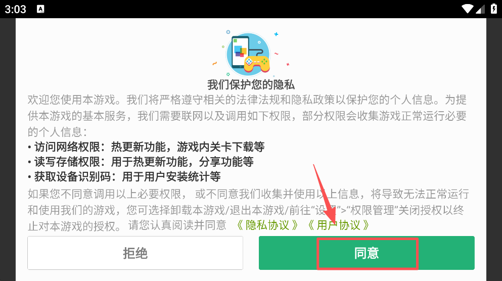 1、在游戏启动时,点击“同意”按钮以接受隐私政策,开始游戏。