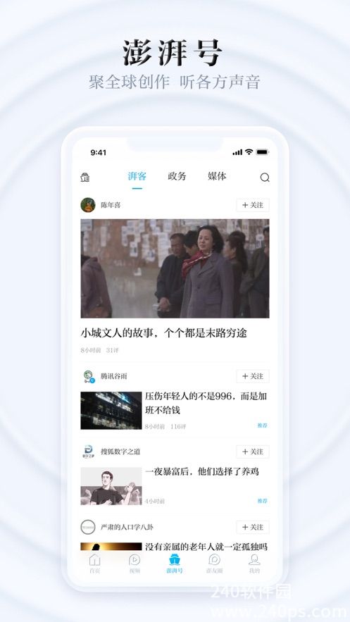 安卓澎湃新闻手机app官方版免费安装下载是一款不断进步,勇于创新的手机新媒体社交平台,澎湃新闻手机app官方版免费安装下载这里你能够看到丰富的原创资讯,让你感受到新闻创作的本心,为你呈现更多事件的真相。同时,各大新闻媒体的新闻资讯,在此你也都能够实时接收到,还能订阅你喜欢的频道,在第一时间为你带来最新的相关消息。文字看得累了话,软件内还为你贴心打造了视频专区哦,可以在此以第一视角感受真实的现场,为你实时呈现最新的进展,喜欢看新闻的朋友可不能错过这款软件,快来240软件园下载起来吧!