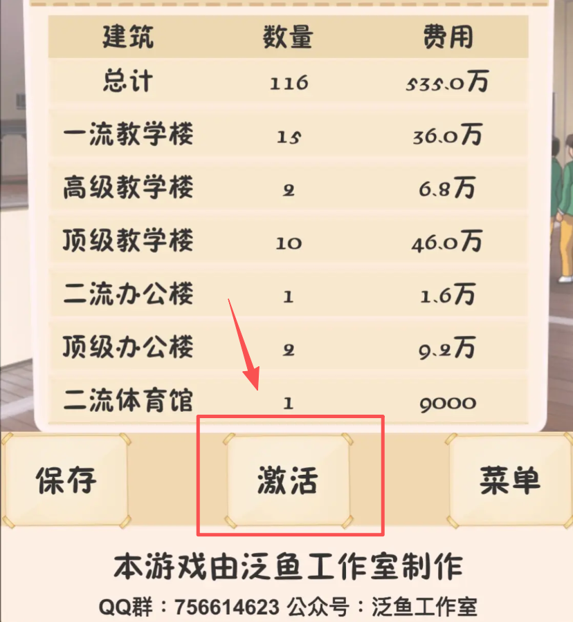 4、在建筑管理界面,点击“激活”按钮,激活顶级办公楼以提升学校设施。