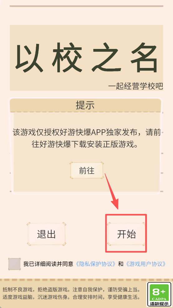 1、点击“开始”按钮,进入游戏并同意相关协议,开始你的校园经营之旅。