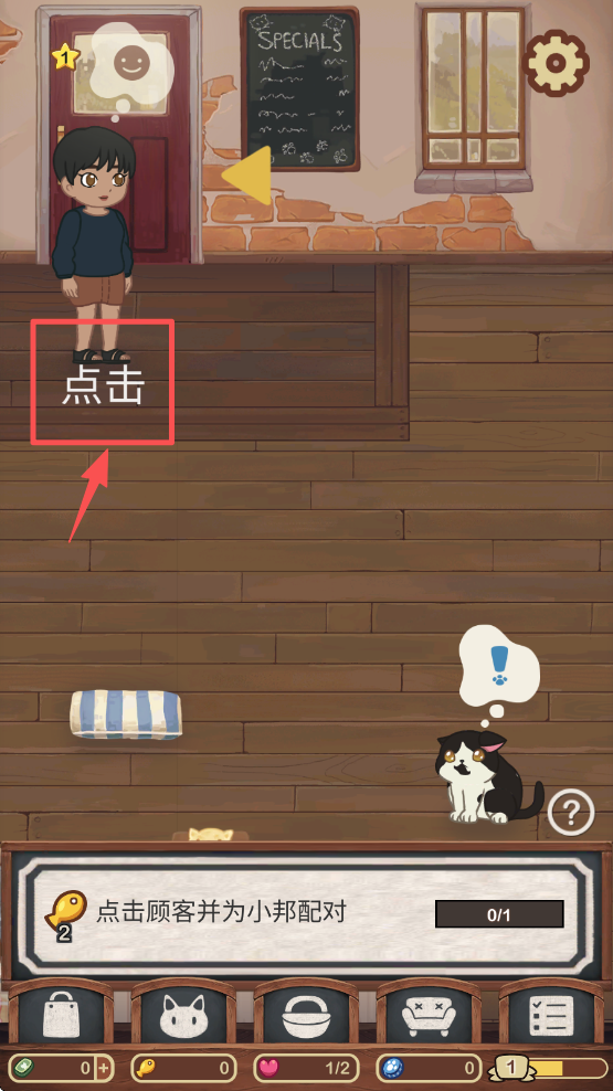 4、点击顾客并为小邦配对,通过互动提升猫咪的幸福感和亲密度。
