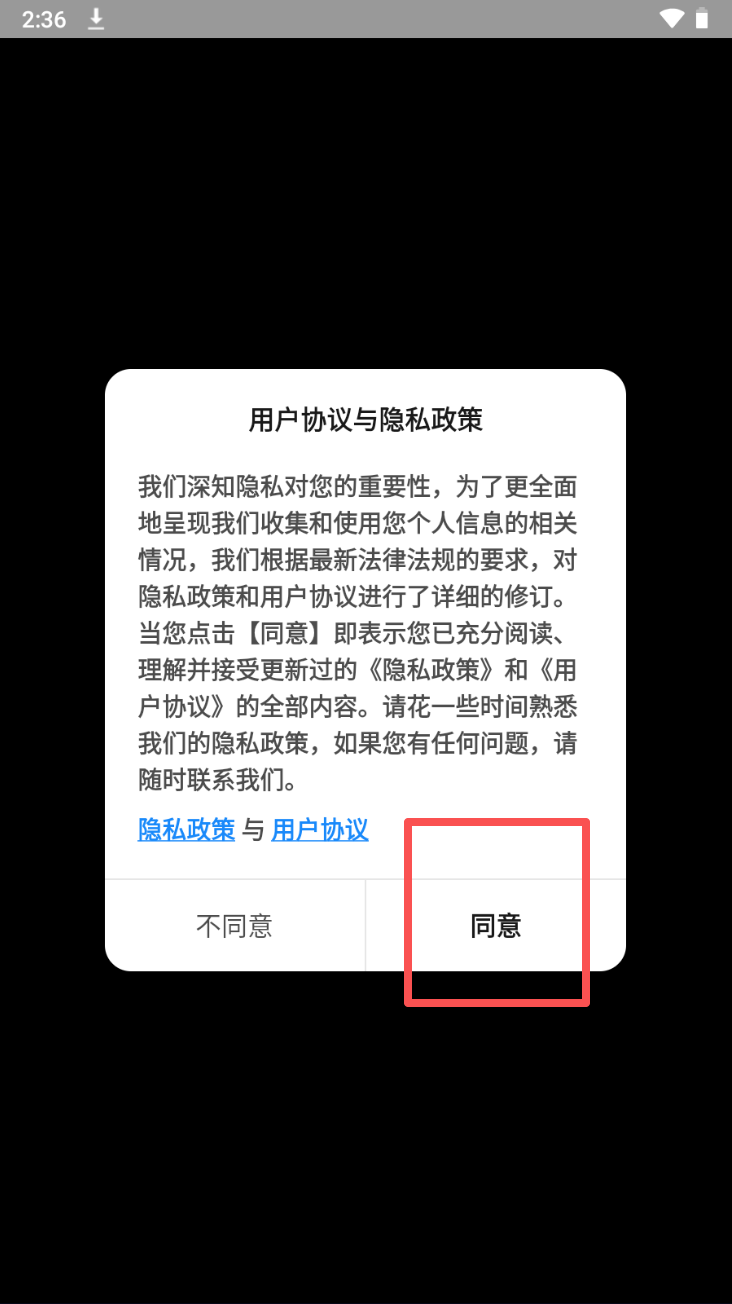 1、在弹出的 “用户协议与隐私政策” 窗口中,点击 “同意” 按钮。