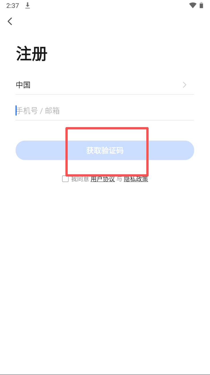 3、在注册页面,输入手机号或邮箱后,点击 “获取验证码” 按钮。