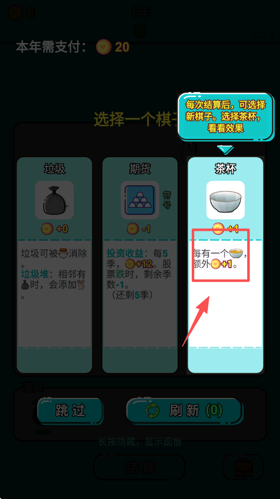 4、在结算后,选择新的棋子,如“茶杯”,以获得额外收益。