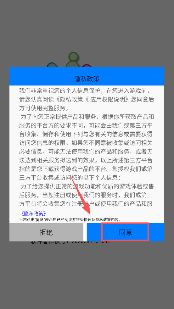 1、点击“同意”按钮,接受隐私政策,开始游戏之旅。