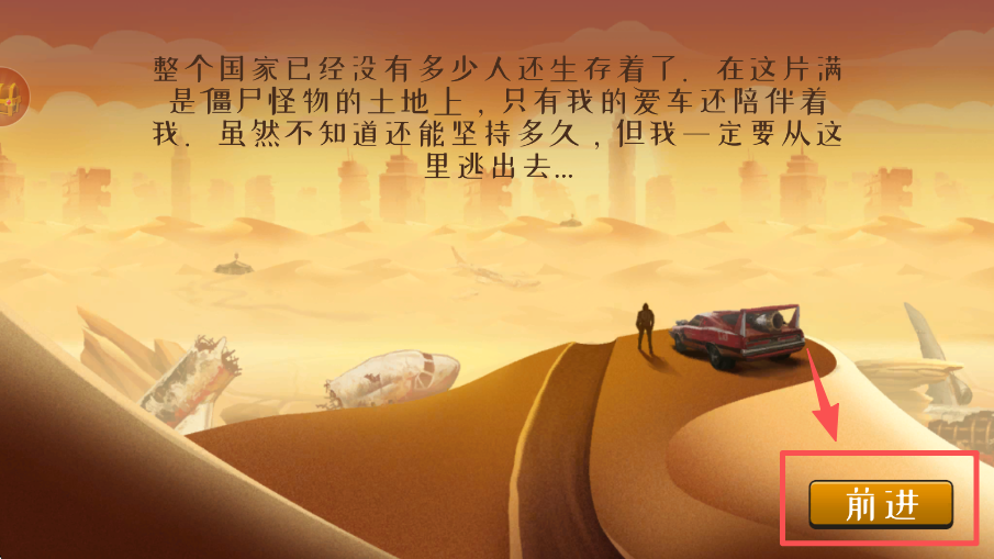 1、点击界面右下角的 “前进” 按钮,进入末日背景下的赛车逃生关卡,开启这场生存冒险。