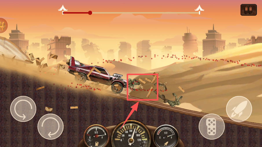 3、驾驶赛车前行时,利用车辆撞击途中出现的僵尸怪物,清除逃生路线上的障碍。