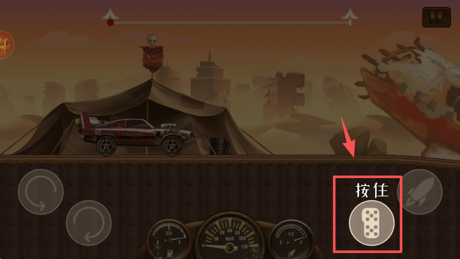 2、在游戏操作界面中,按住右侧标注 “按住” 的按键,控制赛车启动并向前行进。