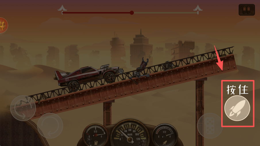 4、遇到复杂路段时,按住右侧火箭图标的按键,让赛车获得推进力,顺利通过该区域。