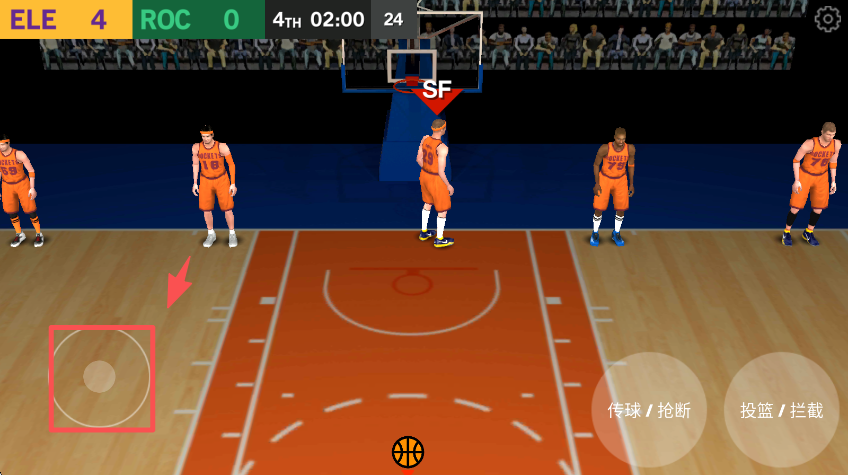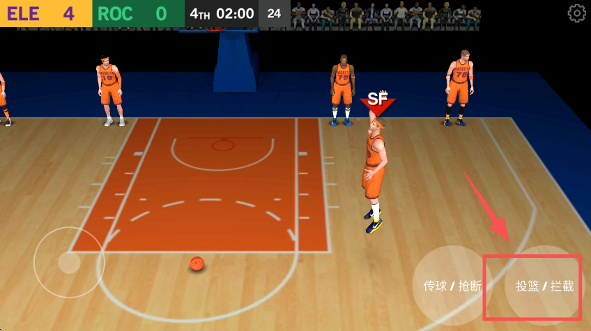 4、在合适时机点击右侧 “投篮 / 拦截” 按钮,尝试得分或防守。