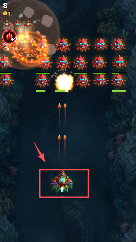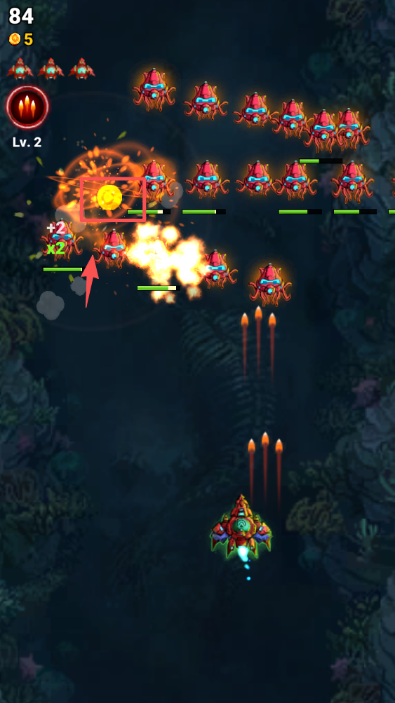 4、消灭敌人后,收集掉落的金币和道具,提升飞船等级和能力,继续战斗。