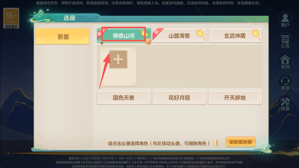 1、首先,选择服务器,点击“锦绣山河”进入,或点击“+”创建新服务器。
