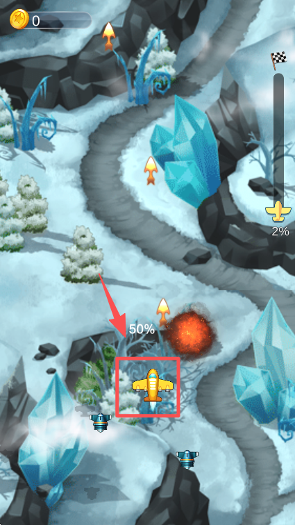2、进入雪地赛道关卡后,操控红色框标注的黄色飞机,在赛道中前进,同时躲避场景里的障碍。