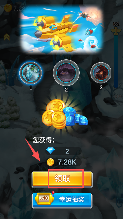 4、关卡结束后,在结算界面点击红色框的 “领取” 按钮,获取本次游玩得到的金币与钻石奖励。