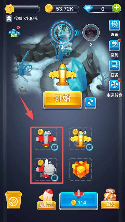 1、在游戏主界面,点击红色框内带金币标识的飞机选项,获取对应资源,为进入关卡做准备。