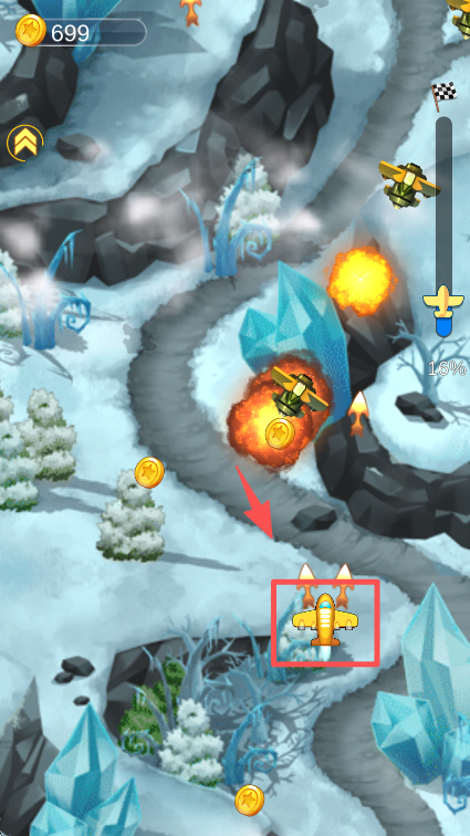 3、游玩关卡时,操控红色框的黄色飞机,攻击敌方飞机,同步收集赛道中出现的金币资源。