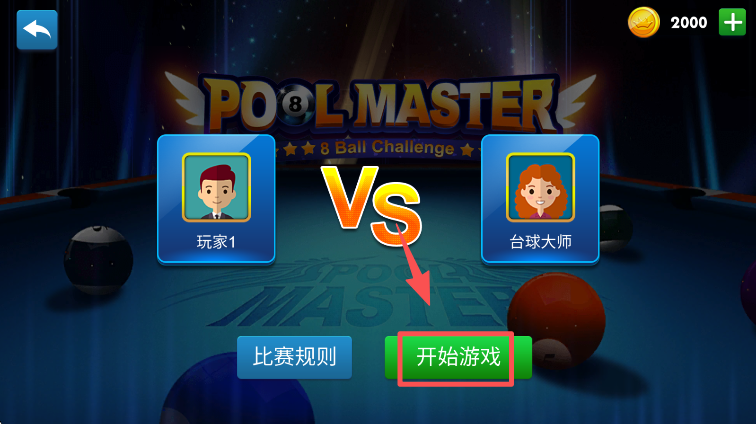 1、在对战匹配界面,找到红色框标注的 “开始游戏” 按钮并点击,进入与台球大师的对战环节。