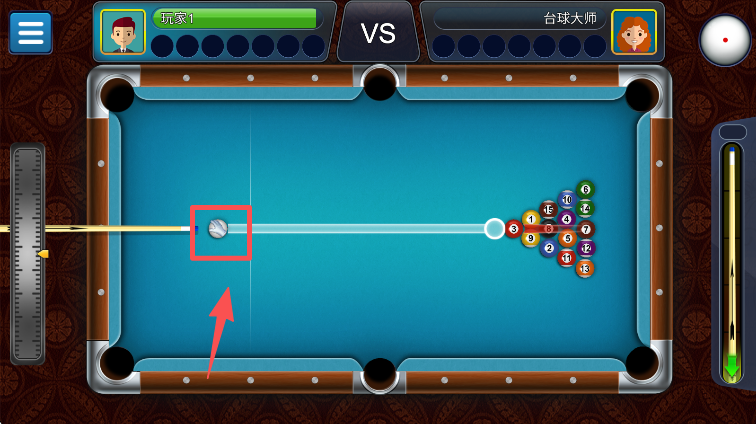 2、进入对战台球桌界面后,确认红色框标注的白球,准备开展击球前的瞄准等操作。
