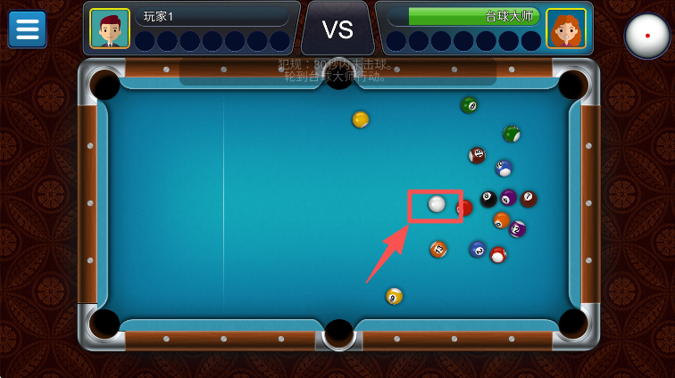 4、完成击球后,等待对手操作,后续可依据红色框标注的白球位置,准备下一轮击球。