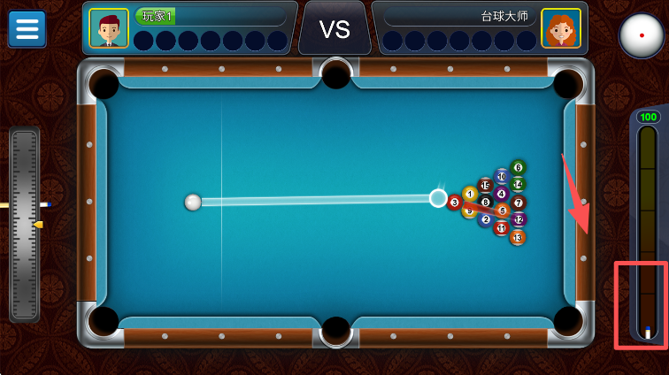 3、瞄准目标球后,拖动右侧红色框内的力量条,调整击球力度,完成本次击球的操作。