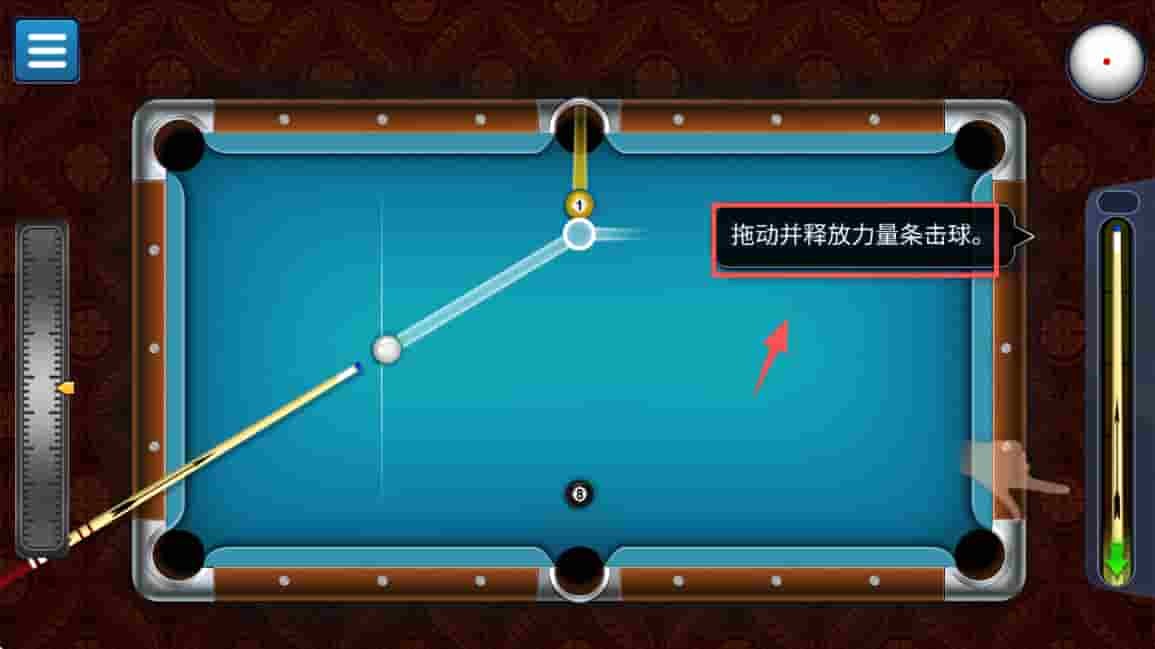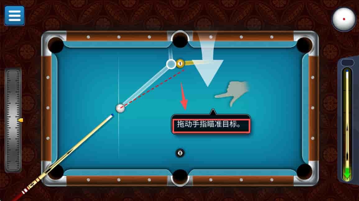 2、进入击球界面后,根据提示拖动手指,对准红色框里的 1 号球,完成击球前的瞄准步骤。