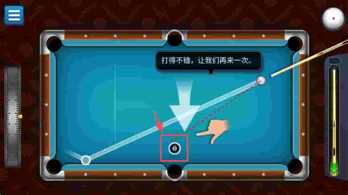 4、首次击球完成后,根据提示瞄准红色框内的 8 号球,准备进行下一次的击球操作。