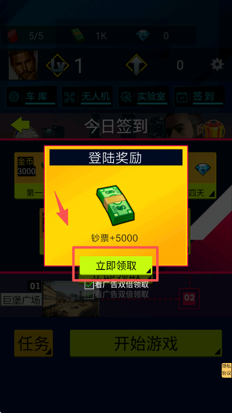 1、看到弹出的 “登录奖励” 窗口,点击带红色框的 “立即领取” 按钮,领取 5000 钞票的签到奖励。