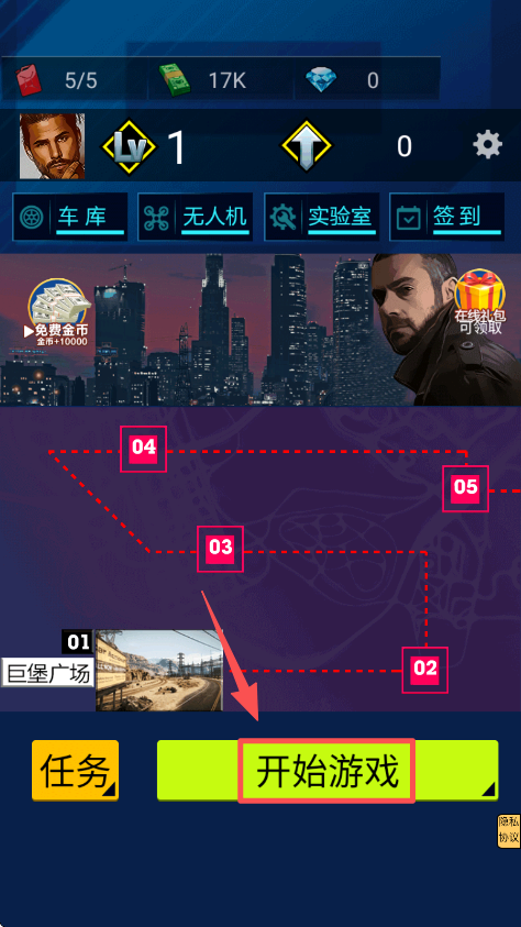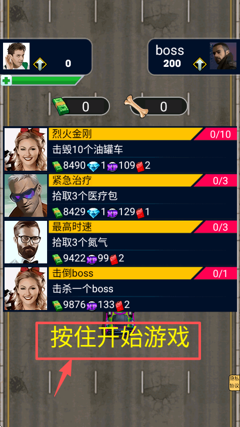 3、进入任务界面后,找到标注的 “按住开始游戏” 区域并按住,触发游戏的启动准备流程。