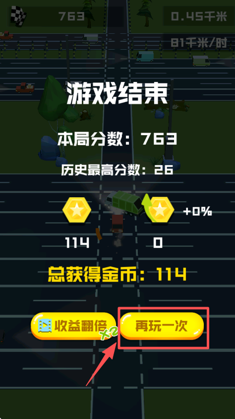 3、游戏结束后,点击 “再玩一次” 按钮,即可重新开启公路赛车的对局。