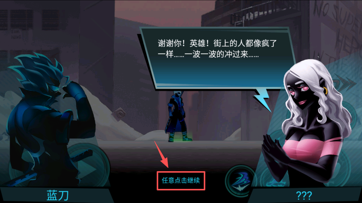 1、点击屏幕上的“任意点击继续”按钮,开始游戏并跳过对话。