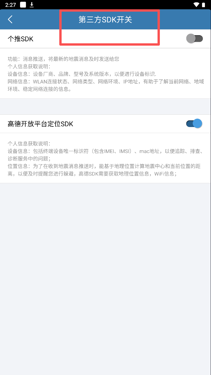 3、在“第三方SDK开关”页面管理个推SDK和高德开放平台定位SDK的开关状态。