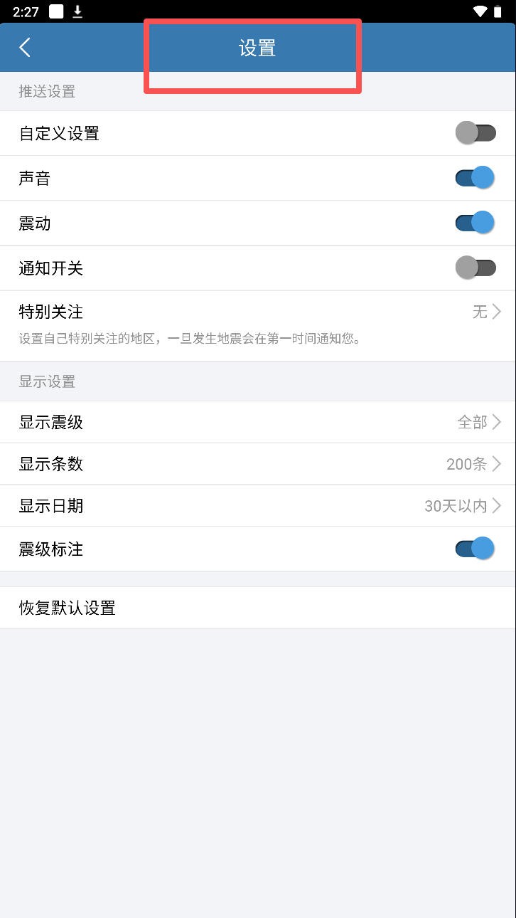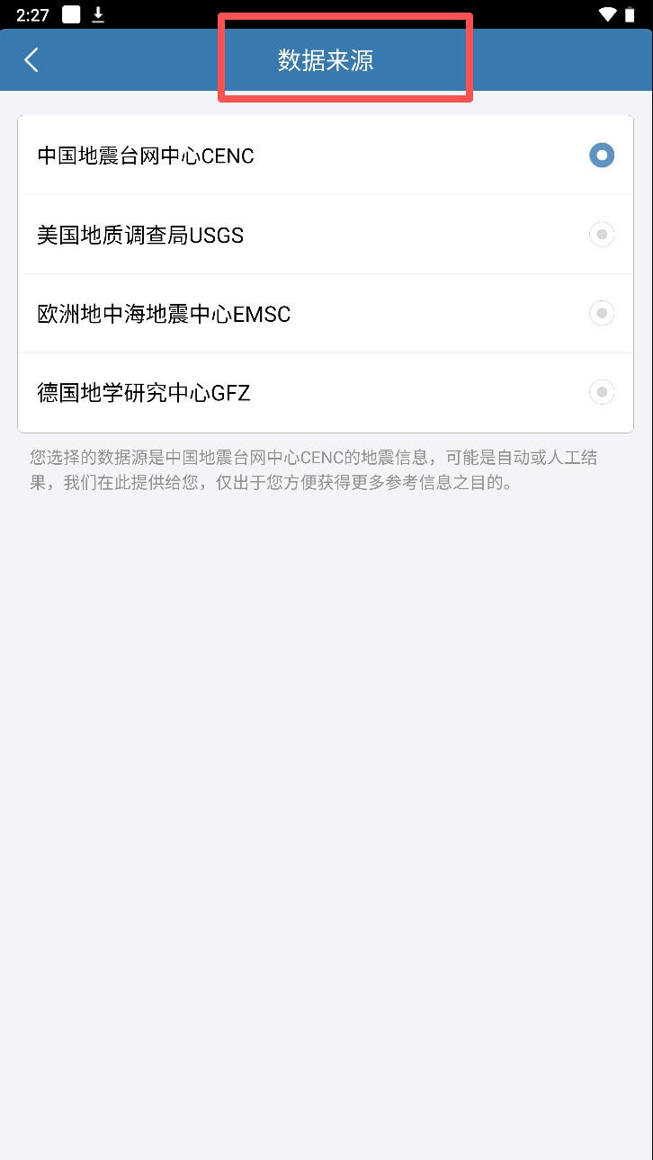 1、在“数据来源”页面选择地震信息来源,如中国地震台网中心CENC。