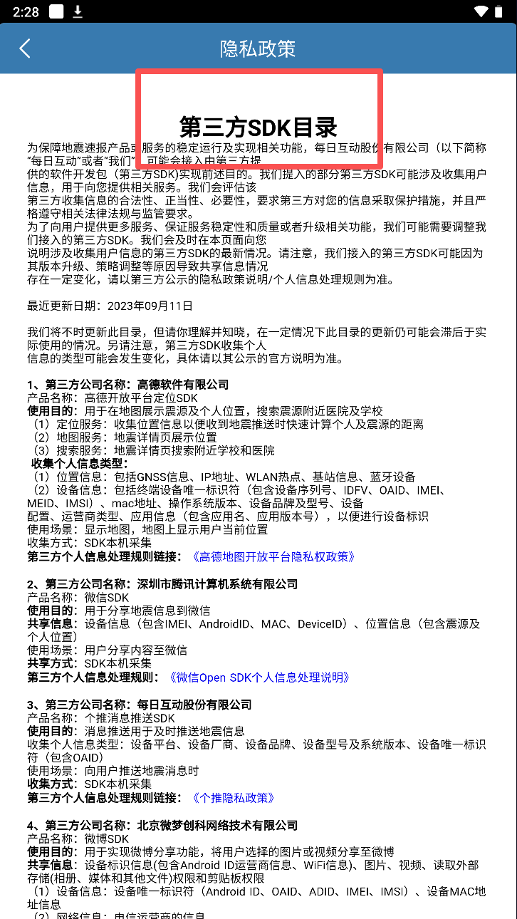 4、阅读“隐私政策”中的第三方SDK目录,了解个人信息处理规则。