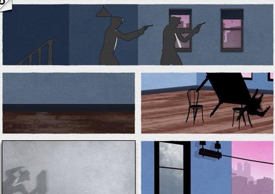 第四关:主人公被警察逼到楼梯顶端,交换图片位置,主人公飞身一跃,利用桌子挡子弹,跳窗逃走。