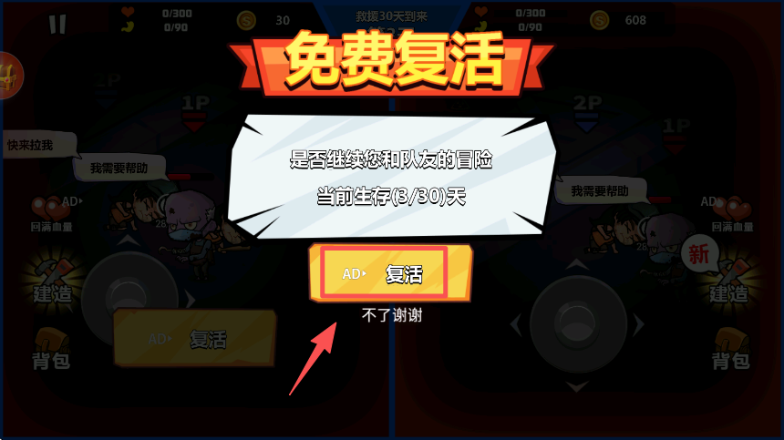 4、弹出 “免费复活” 弹窗时,点击 “AD 复活” 按钮即可继续与队友的冒险。