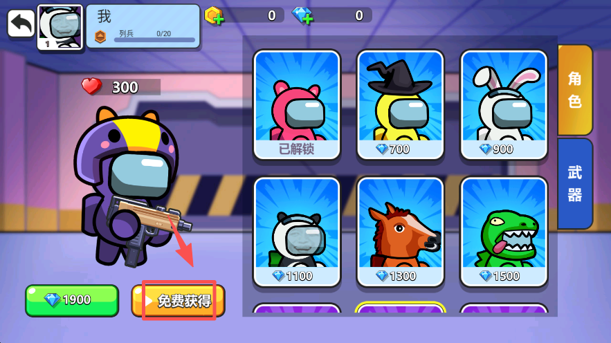 2、在角色界面点击 “免费获得” 按钮,获取对应游戏角色。