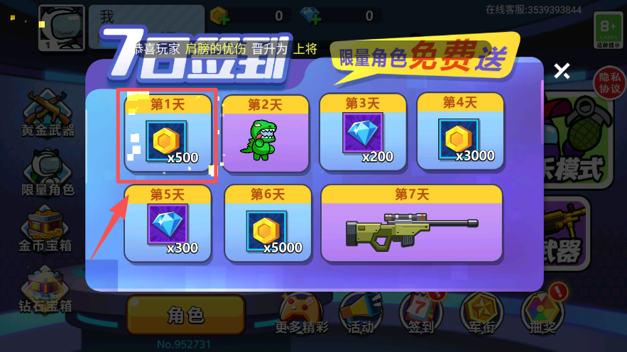 3、在 7 日签到界面,领取第 1 天对应的奖励道具。