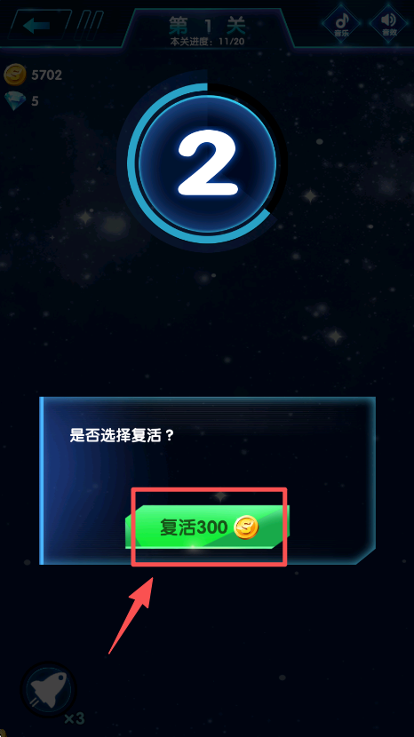 2、在复活提示框中点击 “复活 300” 按钮,消耗金币复活战机。