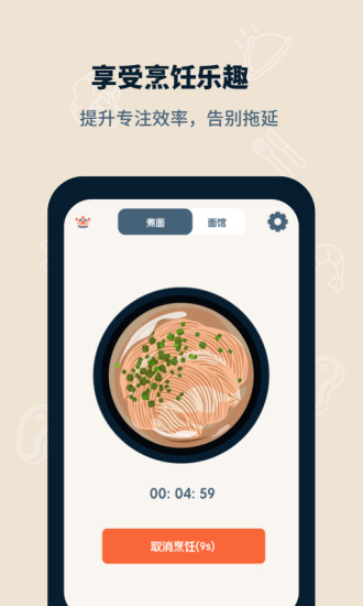 专注面馆app官方版是一款简单高效的时间管理工具软件,这款软件采用了番茄钟的方式,可以锁定手机,让用户可以更好的放下手机专注于学习,工作,运动等内容,拥有非常丰富的面食等你来制作。专注面馆app官方版拥有非常精美的图片,用户可以在倒计时列表中查看面食的制作情况,感受烹饪的乐趣,在完成专注时间后还可以获得面食的收藏奖励,超多面食等你来解锁,还有丰富的成就等你来完成。专注面馆app官方版还提供了便捷的白名单服务,用户可以将学习的软件以及必要的软件添加到白名单中方便使用,喜欢的话千万不要错过,感兴趣的用户快来下载吧。