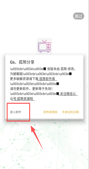1、首次打开点击“进入软件”跳过启动页,切勿升级保持破解功能。