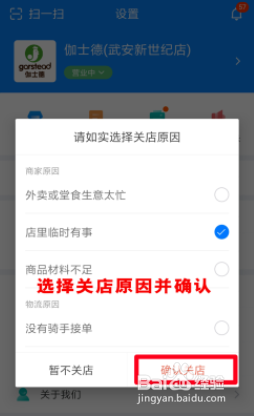选择关店原因,点击确认关店。这样我们就完成了商家版关闭营业。