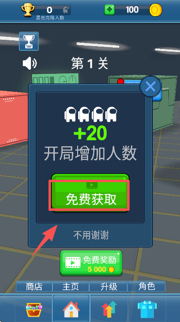 2、在弹窗中点击 “免费获取” 按钮,领取开局增加 20 人的奖励。