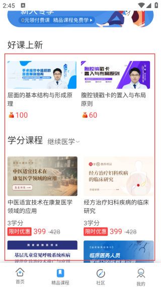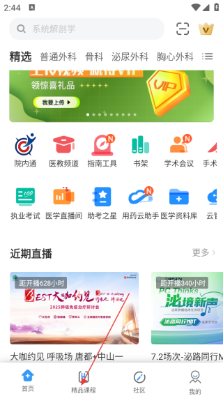 1、打开应用进入首页点击精品课程。