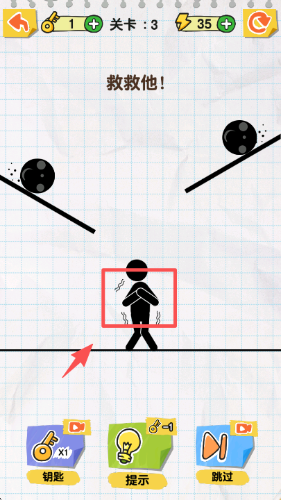 1、在关卡 3 中,在火柴人上方区域画出合适线条,阻挡两侧滚落的黑球,保护火柴人不被砸伤。