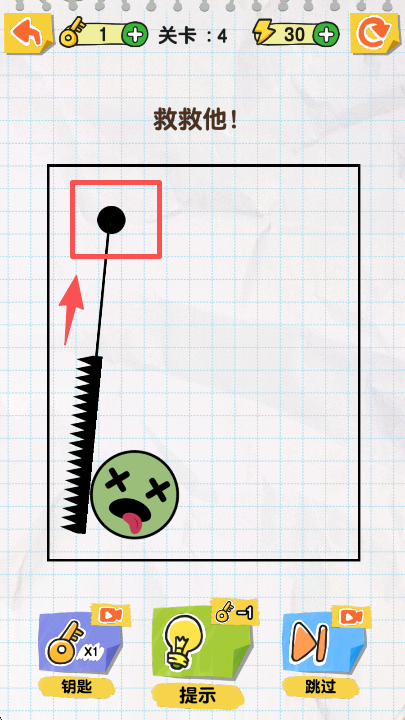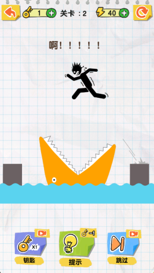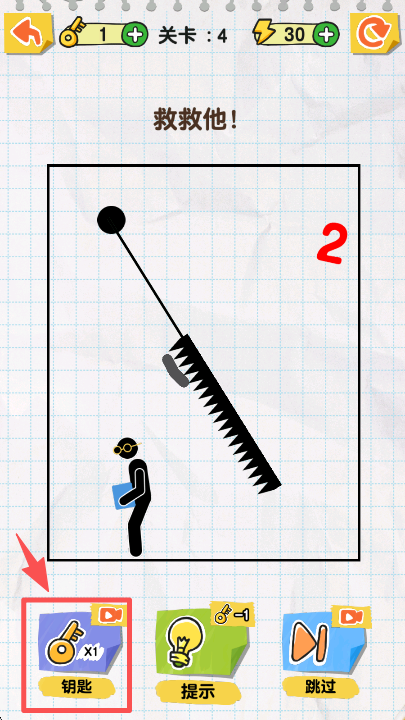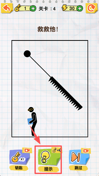 2、关卡 4 遇到锯子危险时,点击界面下方的 “提示” 按钮,获取帮助火柴人的具体操作指引。