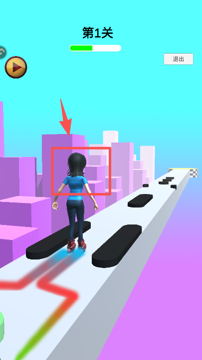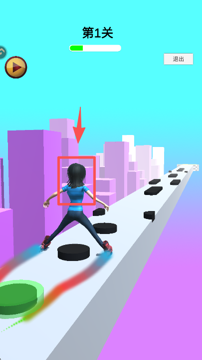 2、进入第 1 关后,持续操控角色左右移动,避开赛道上的黑色障碍物,推进关卡。